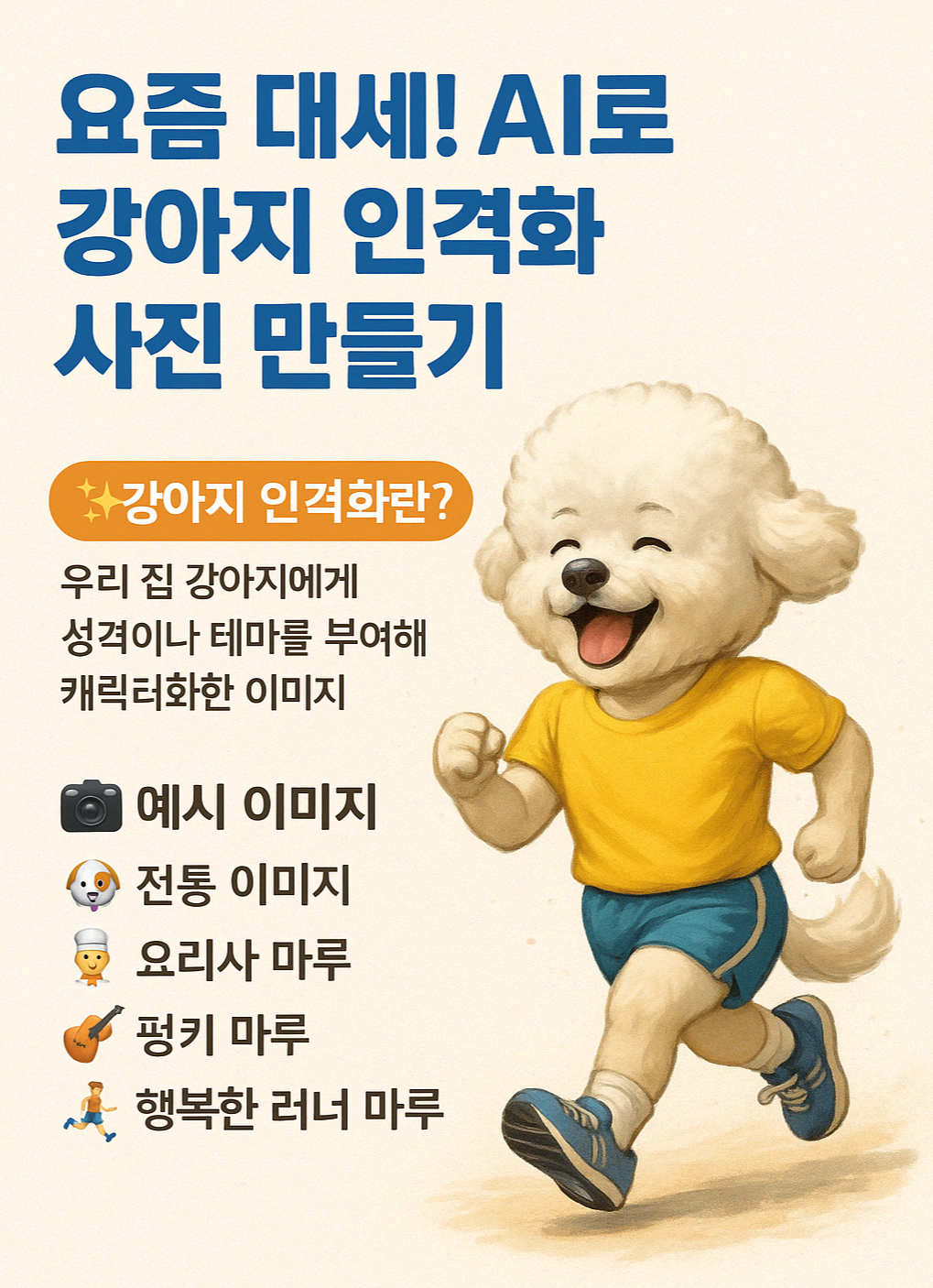 ‘우리 강아지를 주인공으로 만들어보는 시간!’ AI 인격화 사진은 단순한 재미를 넘어서 반려동물과의 추억을 더욱 특별하게 기록할 수 있는 좋은 방법입니다. 여러분도 오늘 마루처럼 귀여운 인격화 이미지 만들어보세요 😊